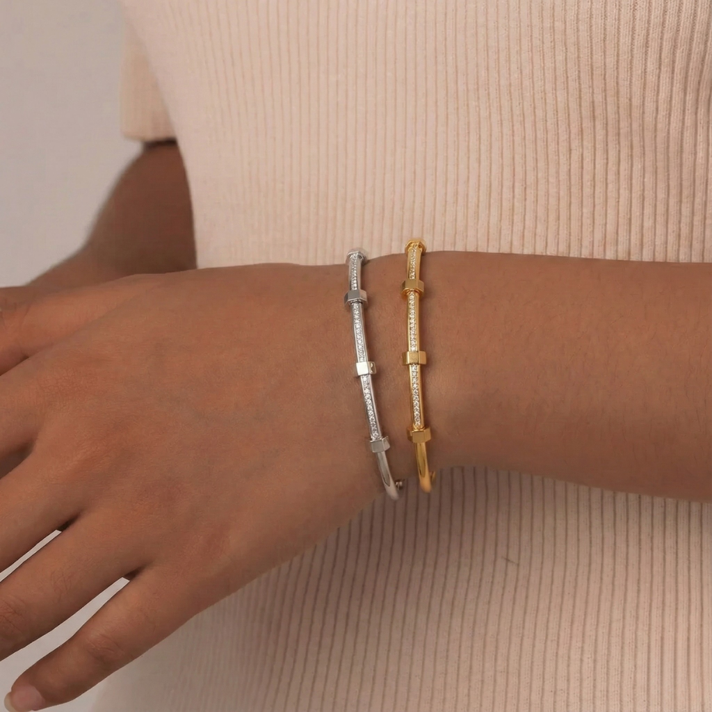 The Diamond Hex Gold Bangle features a sleek, polished silhouette accented with subtle crystal details and hex-shaped elements for a modern, structured look.