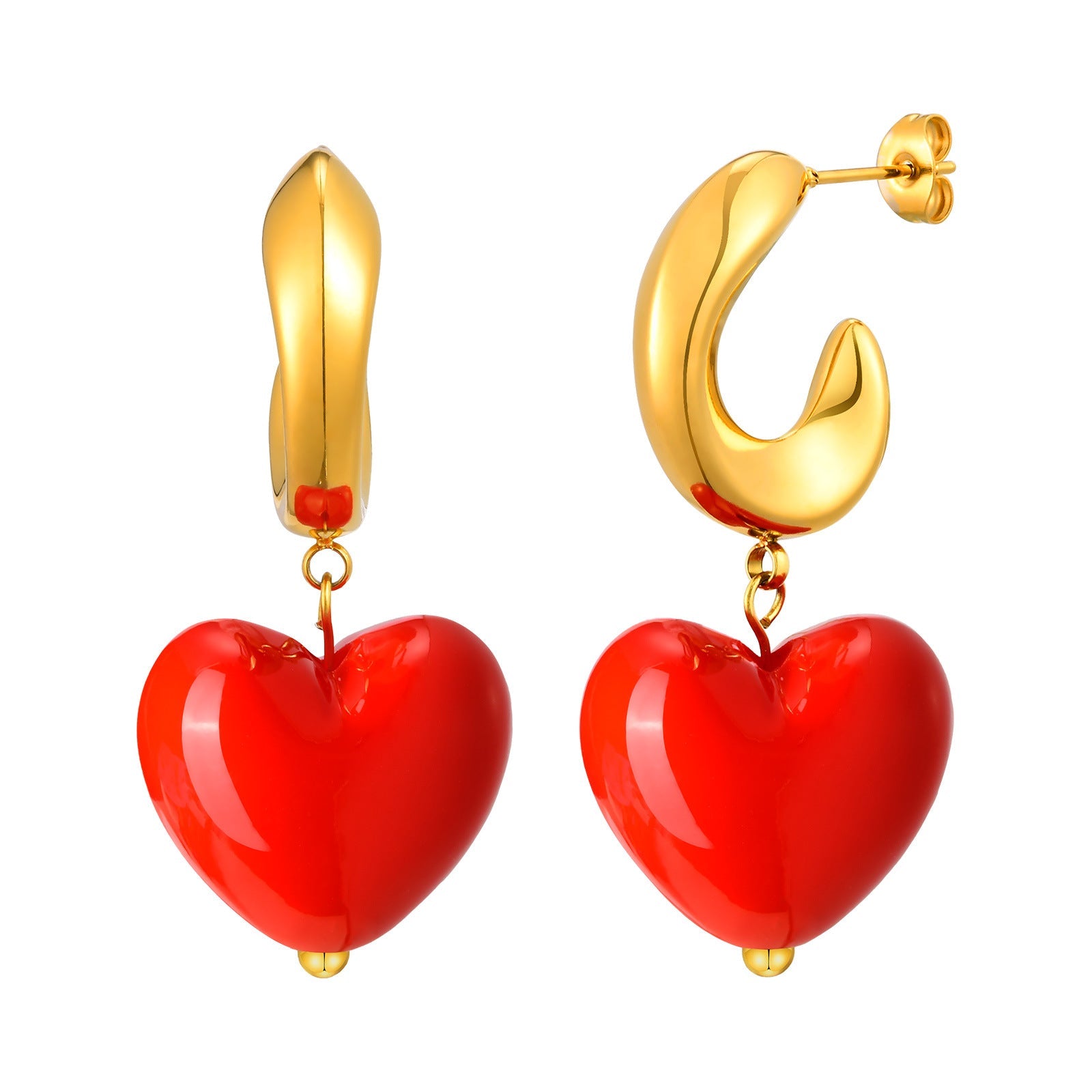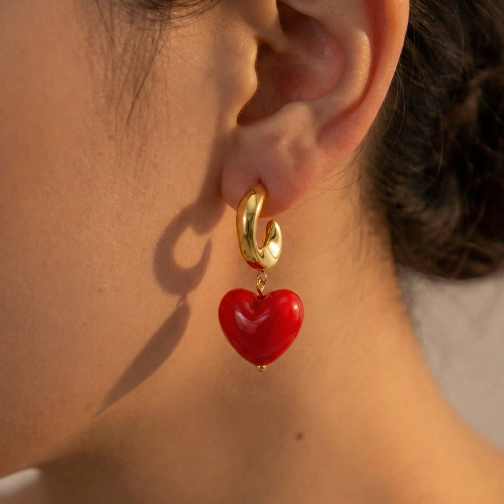 The Glossy Heart Hoop Earrings feature a glossy red heart pendant paired with a chunky gold hoop for a bold yet balanced look.
