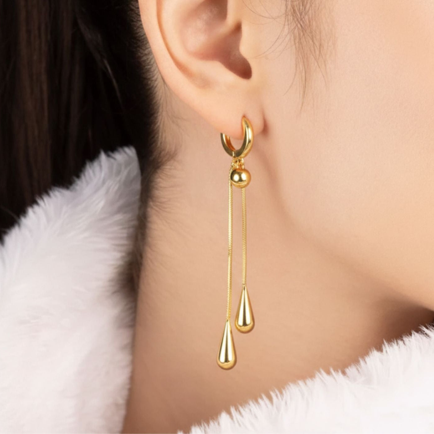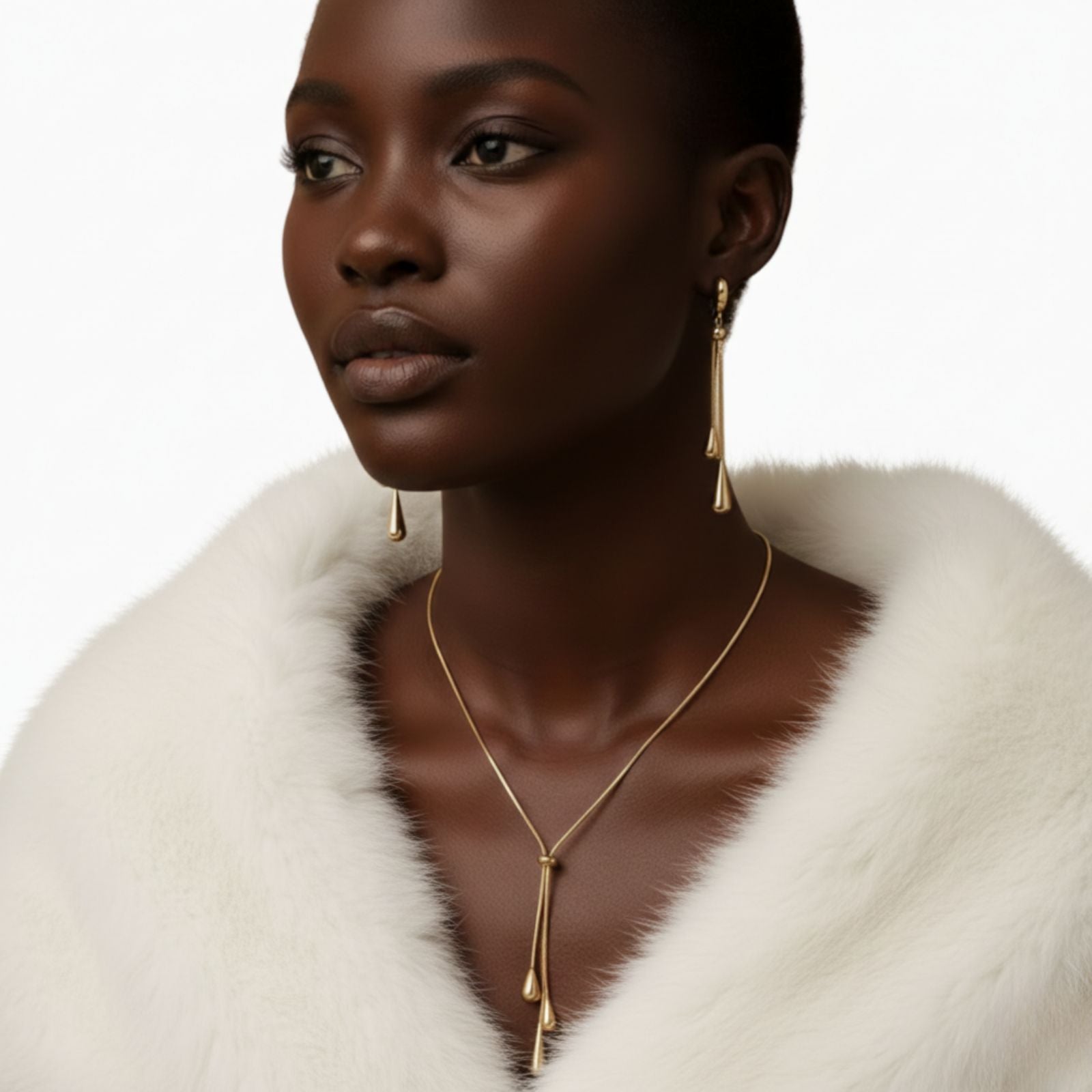 The Adjustable Droplet Necklace & Earrings Set features a refined pull-chain necklace paired with matching droplet earrings for a cohesive and modern look.